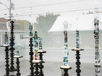 Elvire Bonduelle pose des questions auxquelles d’ordinaire personne ne songe, et suggère aussitôt des réponses propres à déconcerter les esprits rationnels et pragmatiques : depuis que je la connais, j’ai vu Elvire Bonduelle se poser plusieurs fois la question « comment écrire au ciel ? », optant tantôt pour un message gigantesque à flanc de montagne, tantôt pour un télégramme chanté filmé en vidéo, se demander comment on pouvait construire des meubles en se servant du livre de poche comme unité de mesure – et le faire-, choisir le motif du faux bois pour imprimer le tissus de ses coussins, on pourrait à loisir poursuivre la liste des intuitions singulières qui sont les siennes. Elle porte sur le monde un regard décalé, ironique et bienveillant, qui se traduit dans des objets nets et impeccables, flirtant avec le design sans que l’on puisse les ranger véritablement dans cette rubrique.